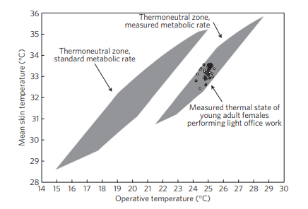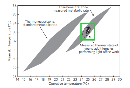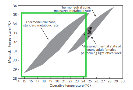 Then in the middle of the chart, there’s this little bunch of dots. Those dots are from a study where they actually measured the comfort levels and skin temperatures of real women working in offices. And they’re way off from that original 1960s zone.