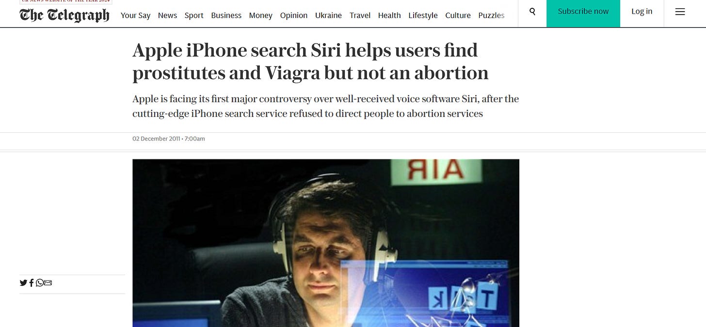 When Siri launched, she could help you find prostitutes and Viagra, but if you told her you’d need an abortion, it balatantly claimed that it was anti-abortion.